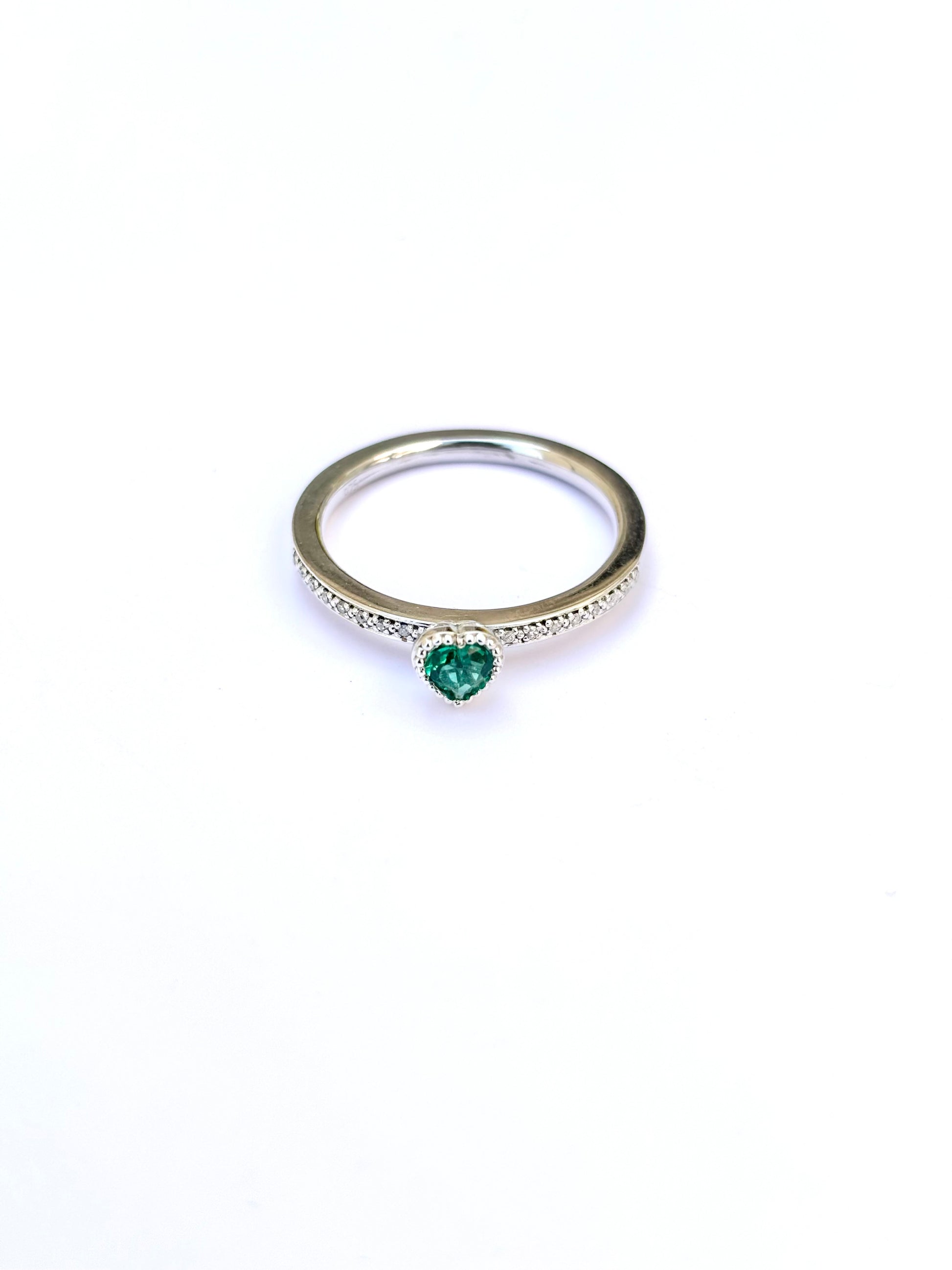 A delicate expression of elegance, the Emerald Whisper Ring features a heart-shaped created emerald at its center, symbolizing love and renewal. Accentuated by a diamond-studded band, this timeless piece is crafted in sterling silver, making it perfect for everyday wear or special moments.