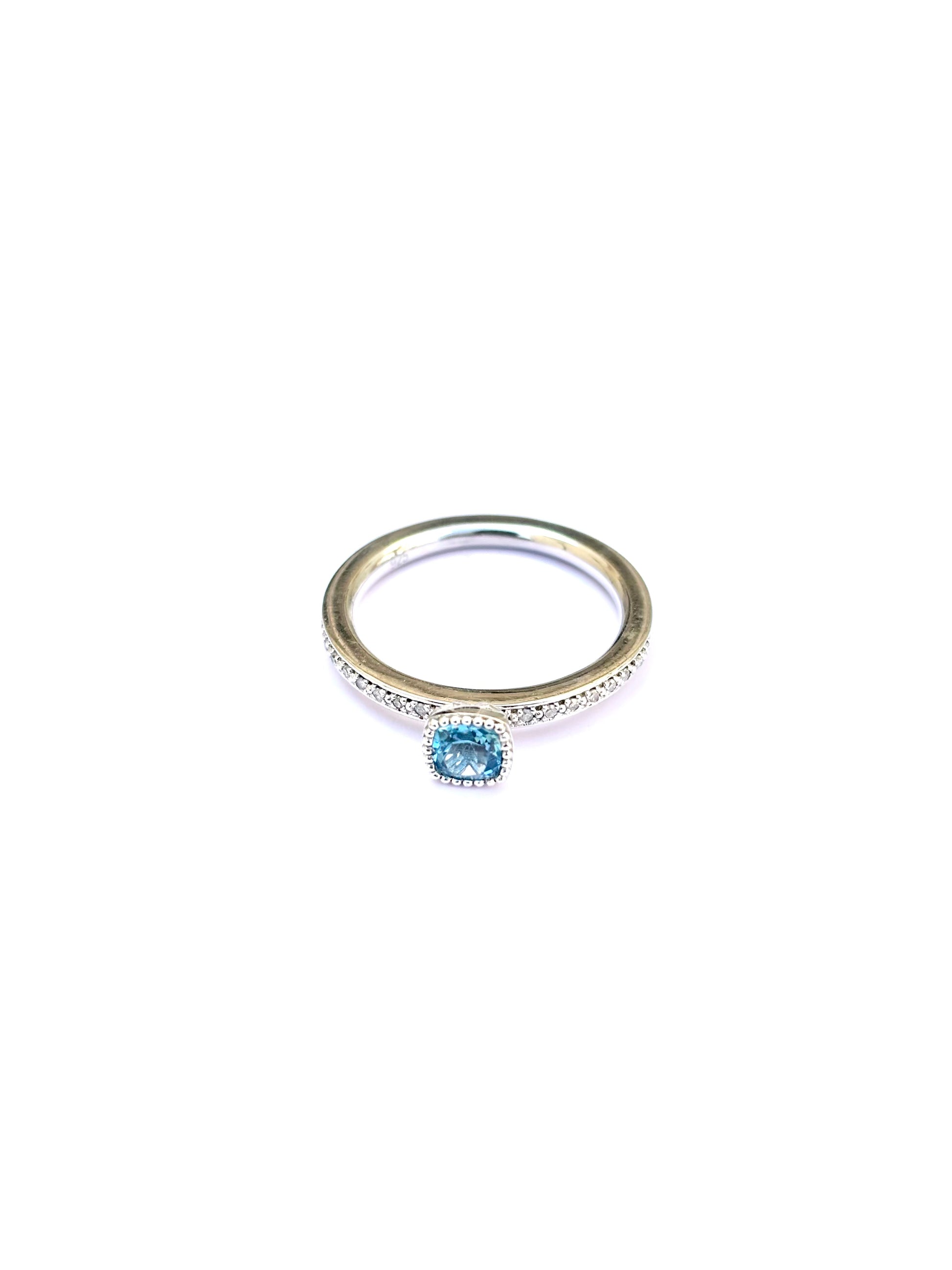 Featuring a cushion-cut blue topaz at the center, this ring exudes elegance with its serene oceanic hue. Framed by diamonds along the band, it’s a timeless piece that blends sophistication with a touch of everyday luxury.